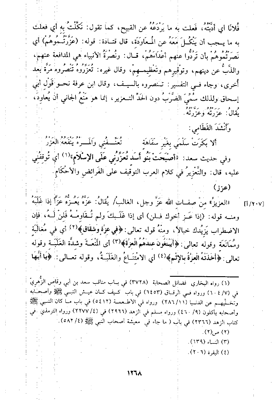 فلانا أي أدبته، فعلت به ما يردعه عن القبيح، كما تقول: نكلت به أي فعلت به ما يجب أن ينكل معه عن المعاودة، قال قتادة: قوله: (عزرتموهم) أي نصرتموهم بأن تردوا عنهم أعداءهم، قال: ونصرة الأنبياء هي المدافعة عنهم، والذب عن دينهم، وتوقيرهم وتعظيمهم، وقال غيره: تعزروه تنصروه مرة بعد أخرى، وجاء في التفسير: تنصروه بالسيف، وقال ابن عرفة نحو قول أبي إسحاق ولذلك سمي الضرب دون الحد والتعزير، إنما هو منع الجاني أن يعاود، يقال: عزرته وعزرته.