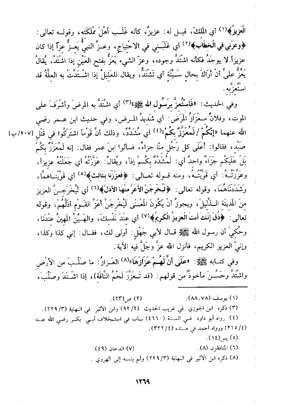العزيز} أي الملك، قيل له: عزيز، كأنه غلب أهل مملكته، وقوله تعالى: {وعزني في الخطاب} أي غلبني في الاحتياج، وعز النبي يعز عزا إذا كان عزيزا لا يوجد فكأنه اشتد وجوده، وعز الشيء يعز بفتح العين إذا اشتد، يقال يعز على أن أراك بحال سيئة أي تشتد، ويقال للعليل إذا اشتدت به العلة قد استعزبه.