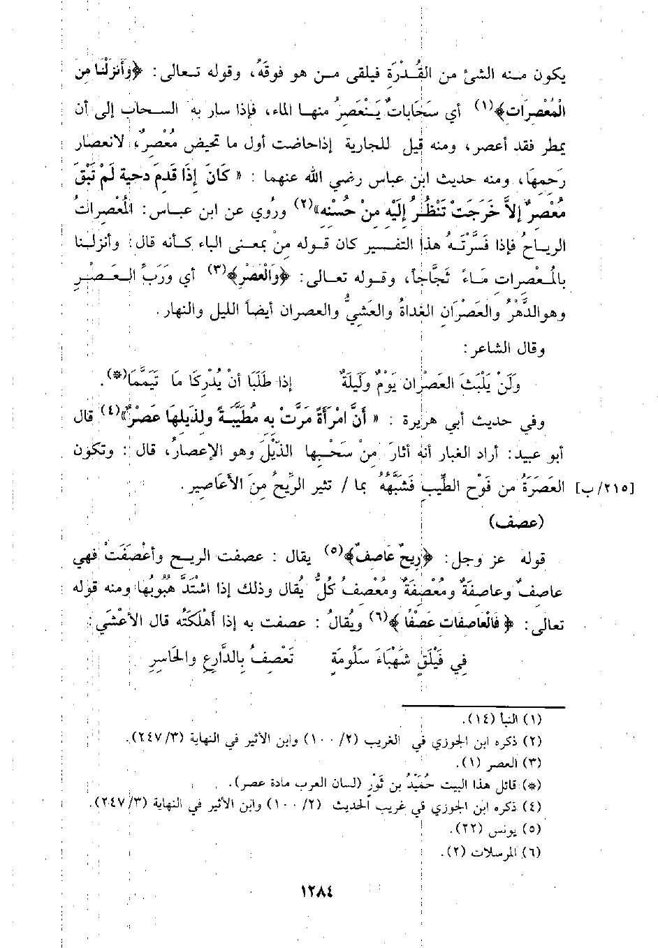 يكون منه الشيء من القدرة فيلقى من هو فوقه، وقوله تعالى: {وأنزلنا من المعصرات} أي سحابات ينعصر منها الماء، فإذا سار به السحاب إلى أن يمطر فقد أعصر، ومنه قيل للجارية إذا حاضت أو لما تحيض معصر، لأنعصار رحمها، ومنه حديث ابن عباس رضي الله عنهما: (كان إذا قدم دحية لم تبق معصر إلا خرجت تنظر إليه من حسنه) وروي عن ابن عباس: المعصرات الرياح فإذا فسرته هذا التفسير كان قوله من بمعنى الباء كأنه قال: وأنزلنا بالمعصرات ماء ثجاجا، وقوله تعالى: {والعصر} أي ورب العصر وهو الدهر والعصران الغداة والعشي والعصران أيضا الليل والنهار.