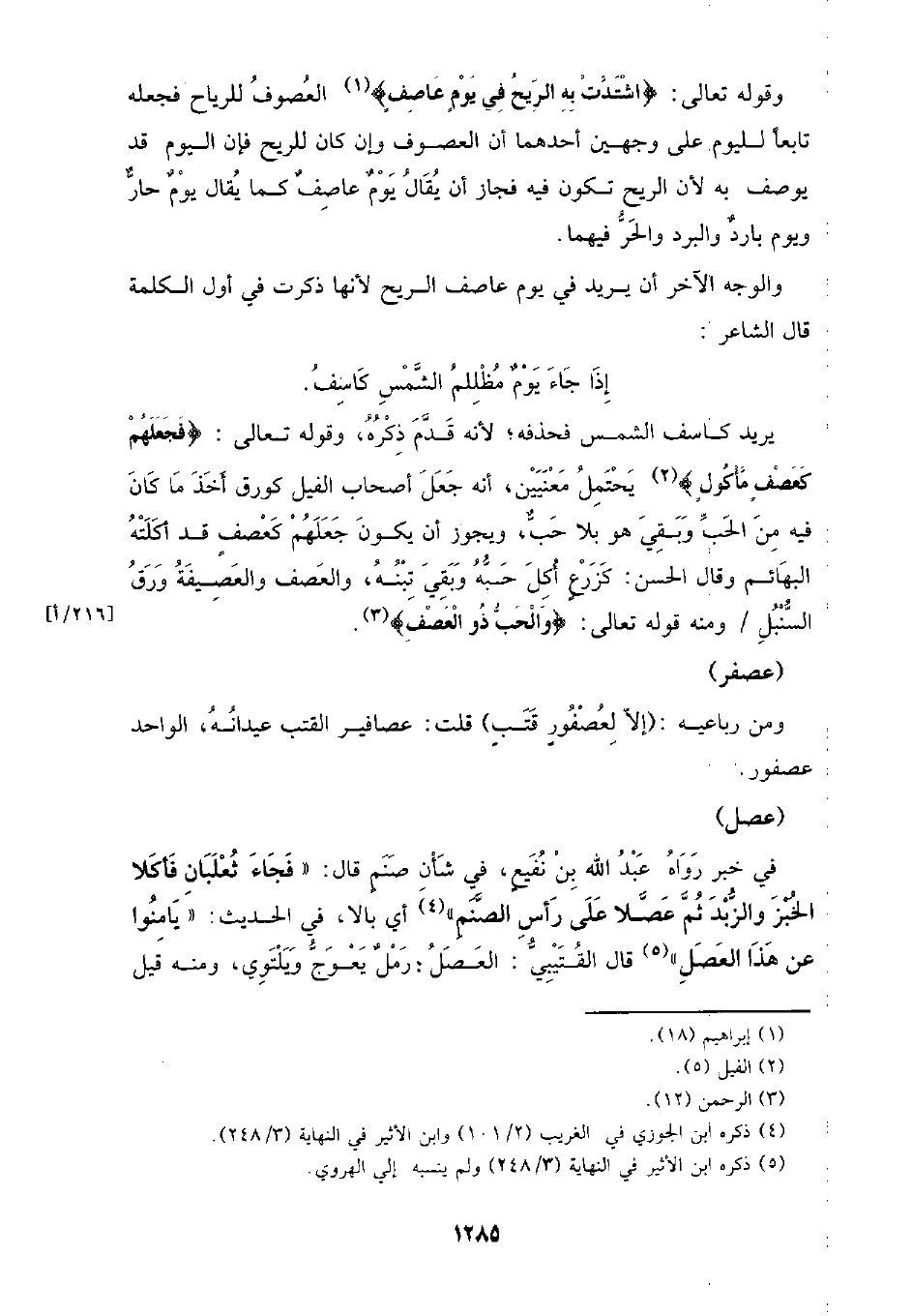 يريد كاسف الشمس فحذفه؛ لأنه قدم ذكره، وقوله تعالى: {فجعلهم كعفص مأكول} يحتمل معنيين، أنه جعل أصحاب الفيل كورق أخذ ما كان فيه من الحب وبقي هو بلا حب، ويجوز أن يكون جعلهم كعصف قد أكلته البهائم وقال الحسن: كزرع أكل حبه وبقي تبنه، والعصف والعصيفة ورق السنبل /ومنه قوله تعالى: {والحب ذو العصف}.