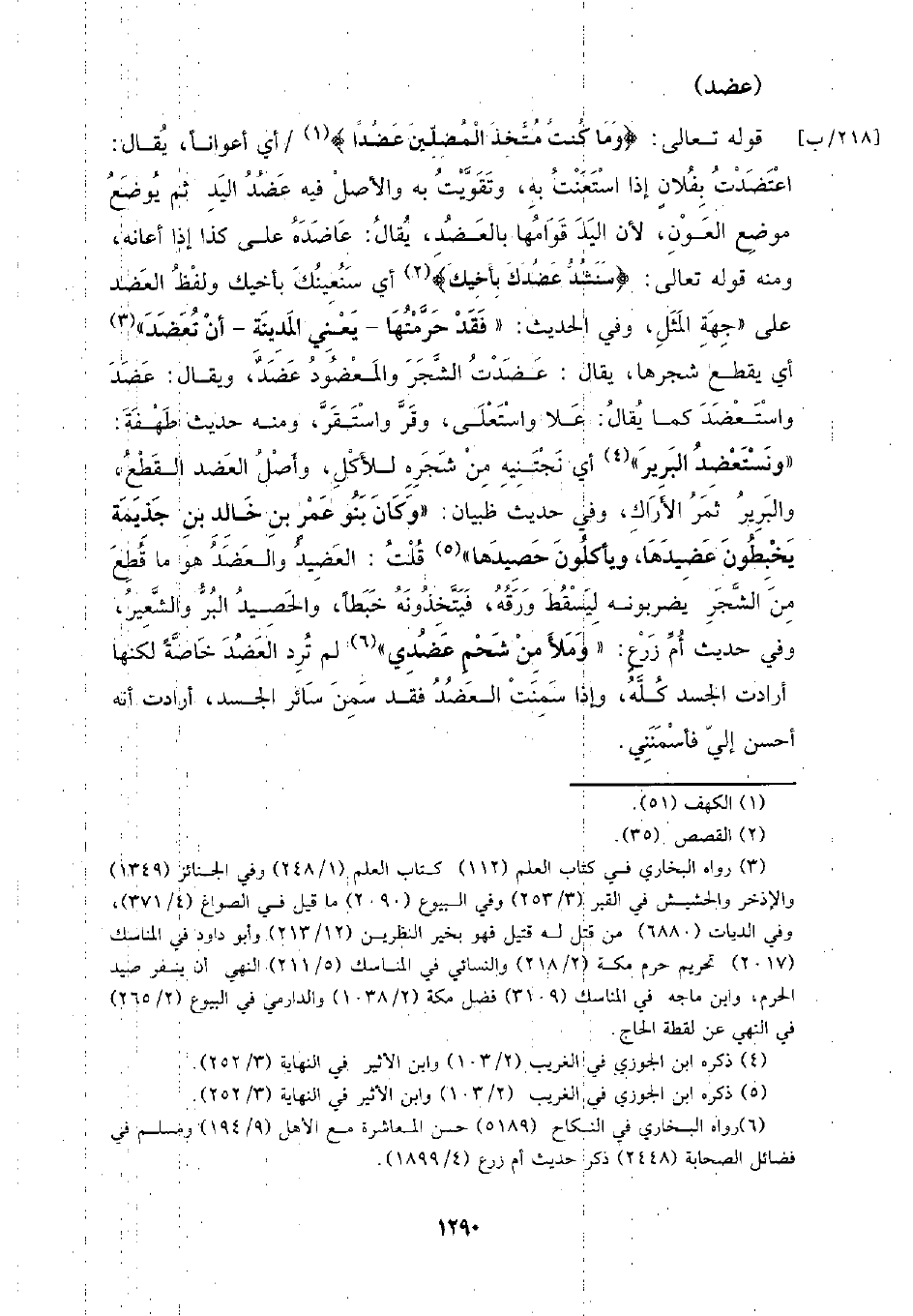 قوله تعالى: {وما كنت متخذ المضلين عضدا} /أي أعوانا، يقال: اعتضدت بفلان إذا استعنت به، وتقويت به والأصل فيه عضد اليد ثم يوضع موضع العون، لأن اليد قوامها بالعضد، يقال: عاضده على كذا إذا أعانه، ومنه قوله تعالى: {سنشد عضدك بأخيك} أي سنعينك بأخيك ولفظ العضد على (جهة المثل، وفي الحديث: (فقد حرمتها- يعني المدينة- أن تعضد) أي يقطع شجرها، يقال: عضدت الشجر والمعضود عضد، ويقال: عضد واستعضد كما يقال: علا واستعلى، وقر واستقر، ومنه حديث طهفة، (ونستعضد البرير) أي نجتنيه من شجره للأكل، وأصل العضد القطع، والبرير ثمر الأراك، وفي حديث ظبيان: (وكان بنو عمر بن خالد بن جذيمة يخبطون عضيدها، ويأكلون حصيدها) قلت: العضيد والعضد هو ما قطع من الشجر يضربونه ليسقط ورقه، فيتخذونه خيطا، والحصد البر والشعير، وفي حديث أم زرع: (وملأ من شحم عضدي) لم ترد العضد خاصة لكنها أرادت الجسد كله، وإذا سمنت العضد فقد سمن سائر الجسد، أرادت أنه أحسن إلى فأسمنني.