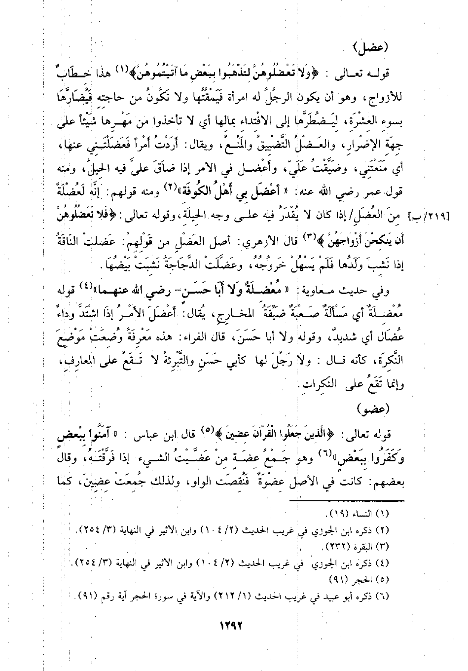 قوله تعالى: {ولا تعضلوهن لتذهبوا ببعض ما آتيتموهن} هذا خطاب للأزواج، وهو أن يكون الرجل له امرأة فيمقتها ولا تكون من حاجته فيضارها بسوء العشرة، ليضطرها إلى الافتداء بمالها أي لا تأخذوا من مهرها شيء على جهة الإضرار، والعضل التضييق والمنع، ويقال: أردت أمرا فعضلتني عنها، أي منعتني، وضيقت علي، وأعضل في الأمر إذا ضاق علي فيه الحيل، ومنه قول عمر رضي الله عنه: (أعضل بي أهل الكوفة) ومنه قولهم: إنه لعضلة من العضل/ إذا كان لا يقدر فيه على وجه الحيلة، وقوله تعالى: {فلا تعضلوهن أن ينكحن أزواجهن) قال الأزهري: أصل العضل من قولهم: عضلت الناقة إذا نشب ولدها فلم يسهل خروجه، وعضلت الدجاجة نشبت بيضها.