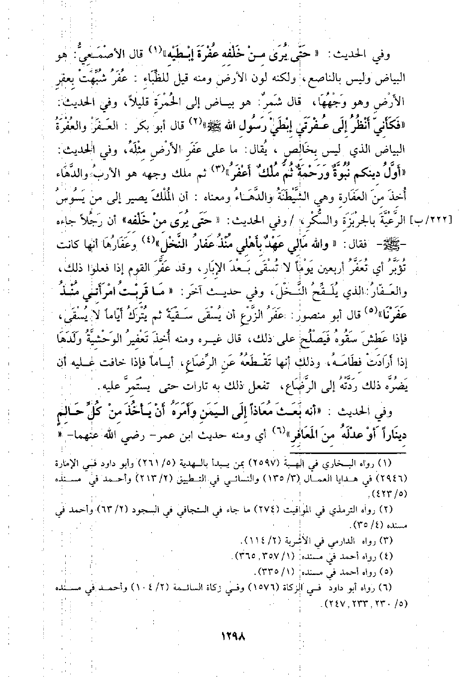 وفي الحديث: (حتى يرى من خلفه عفرة إبطيه) قال الأصمعي: هو البياض وليس بالناصع، ولكنه لون الأرض ومنه قيل للظباء: عفر شبهت بعفر الأرض وهو وجهها، قال شمر: هو بياض إلى الحمرة قليلا، وفي الحديث: (فكأني أنظر إلى عفرتي إبطي رسول الله - صلى الله عليه وسلم -) قال أبو بكر: العفر والفعرة البياض الذي ليس بخالص، يقال: ما على عفر الأرض مثله، وفي الحديث: (أول دينكم نبوة ورحمة ثم ملك أعفر) ثم ملك وجهه هو الأرب والدهاء أخذ من العفارة وهي الشيطنة والدهاء ومعناه: أن الملك يصير إلى من يسوس الرعية بالجربزة والسكر، /وفي الحديث: (حتى يرى من خلفه) أن رجلا جاءه - صلى الله عليه وسلم - فقال: (والله مالي عهد بأهلي منذ عفار النخل) وعفارها أنها كانت تؤبر أي تعفر أربعين يوما لا تسقى بعد الإبار، وقد عفر القوم إذا فعلوا ذلك، والعفار: الذي يلقح النخل، وفي حديث آخر: (ما قربت امرأتي منذ عفرنا) قال أبو منصور: عفر الزرع أن يسقى سقية ثم يترك أياما لا يسقى، فإذا عطش قوه فيصلح على ذلك، قال غيره ومنه أخذ تعفير الوحشية ولدها إذا أرادت فطامه، وذلك أنها تقطعه عن الرضاع، أياما فإذا خافت عليه أ، يضره ذلك ردته إلى الرضاع، تفعل ذلك به تارات حتى يستمر عليه.
