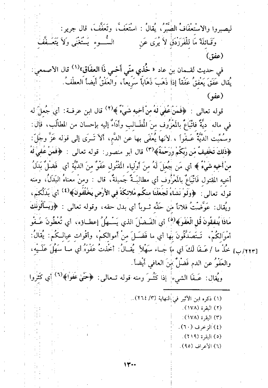 قوله تعالى: {فمن عفي له من أخيه شيء} قال ابن عرفة: أي جعل له في ماله دية فابتاعه بالمعروف من المطالب وأداء إليه بإحسان من المطالب، قال: وسميت الدية عفوا، لأنها يعفى بها عن الدم، ألا ترى إلى قوله عز وجل: {ذلك تخفيف من ربكم ورحمة} قال أبو منصور: قوله تعالى: {فمن عفي له من أخيه شيء} أي من جعل له من أولياء المقتول عفو من الدية أي فضل بدل أخيه المقتول فاتباع بالمعروف أي مطالبة جميلة، قال: ومن معناه البدل، ومنه قوله تعال: {ولو نشاء لجعلنا منكم ملائكة في الأرض يخلفون} أي بدلكم، ويقال: عوضت فلانا من حقه ثوبا أي بدل حقه، وقوله تعالى: {ويسألونك ماذا ينفقون قل العفو} أي الفضل الذي سهل إعطاؤه، أي تعطون عفو أموالكم، تتصدقون بها أي ما فضل من أموالكم، وأقوات عاليكم: يقال: خذ ما /عفا لك أي ما جاء سهلا يقال: أخذت عفوه أي ما سهل عليه، والعفو عن الدم فضل من العافي أيضا.