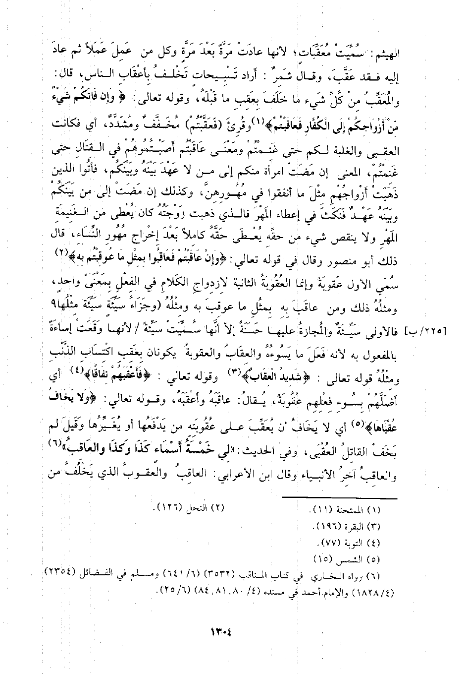 الهيثم: سميت معقبات؛ لأنها عادت مرة بعد مرة وكل من عمل عملا ثم عاد إليه فقد عقب، وقال شمر: أراد تسبيحات تخلف بأعقاب الناس، قال: والمعقب من كل شيء ما خلف بعقب ما قبله، وقوله تعالى: {وإن فاتكم شيء من أزواجكم إلى الكفار فعاقبتم} وقرئ (فعقبتم) مخفف ومشدد، أي فكانت العقبى والغلبة كم حتى غنمتم ومعنى عاقبتم أصبتموهم في القتال حتى غنمتم، المعنى إن مضت امرأة منكم إلى من لا عهد بينه وبينكم، فأتوا الذين ذهبت أزواجهم مثل ما أنفقوا في مهورهن، وكذلك إن مضت إلى من بينكم وبينه عهد فنكث في إعطاء المهر فالذي ذهبت زوجته كان يعطى من الغنيمة المهر ولا نقص شيء من حقه يعطى حقه كاملا بعد إخراج مهور النساء، قال ذلك أبو منصور وقال في قوله تعالى: {وإن عاقبتم فعاقبوا بمثل ما عوقبتم به} سمي الأول عقوبة وإنما العقوبة الثانية لازدواج الكلام في الفعل بمعنى واحد، ومثله ذلك ومن عاقب به بمثل ما عوقب به ومثله (وجزاء سيئة سيئة مثلها فالأولى سيئة والمجازة عليها حسنة إلا أنها سميت سيئة/ لأنها وقعت إساءة بالمفعول به لأنه فعل ما يسوءه والعقاب والعقوبة يكونان بعقب اكتساب الذنب ومثله قوله تعالى: {شديد العقاب} وقوله تعالى: {فأعقبهم نفاقا} أي أضلهم بسوء فعلهم عقوبة، يقال: عاقبه وأعقبه، وقوله تعالى: {ولا يخاف عقباها} أي لا يخاف أن يعقب على عقوبته من يدفعها أو يغيرها وقيل لم يخف القاتل العقبى، وفي الحديث: (لي خمسة أسماء كذا وكذا والعاقب) والعاقب آخر الأنبياء وقال ابن الأعرابي: العاقب والعقوب الذي يخلف من