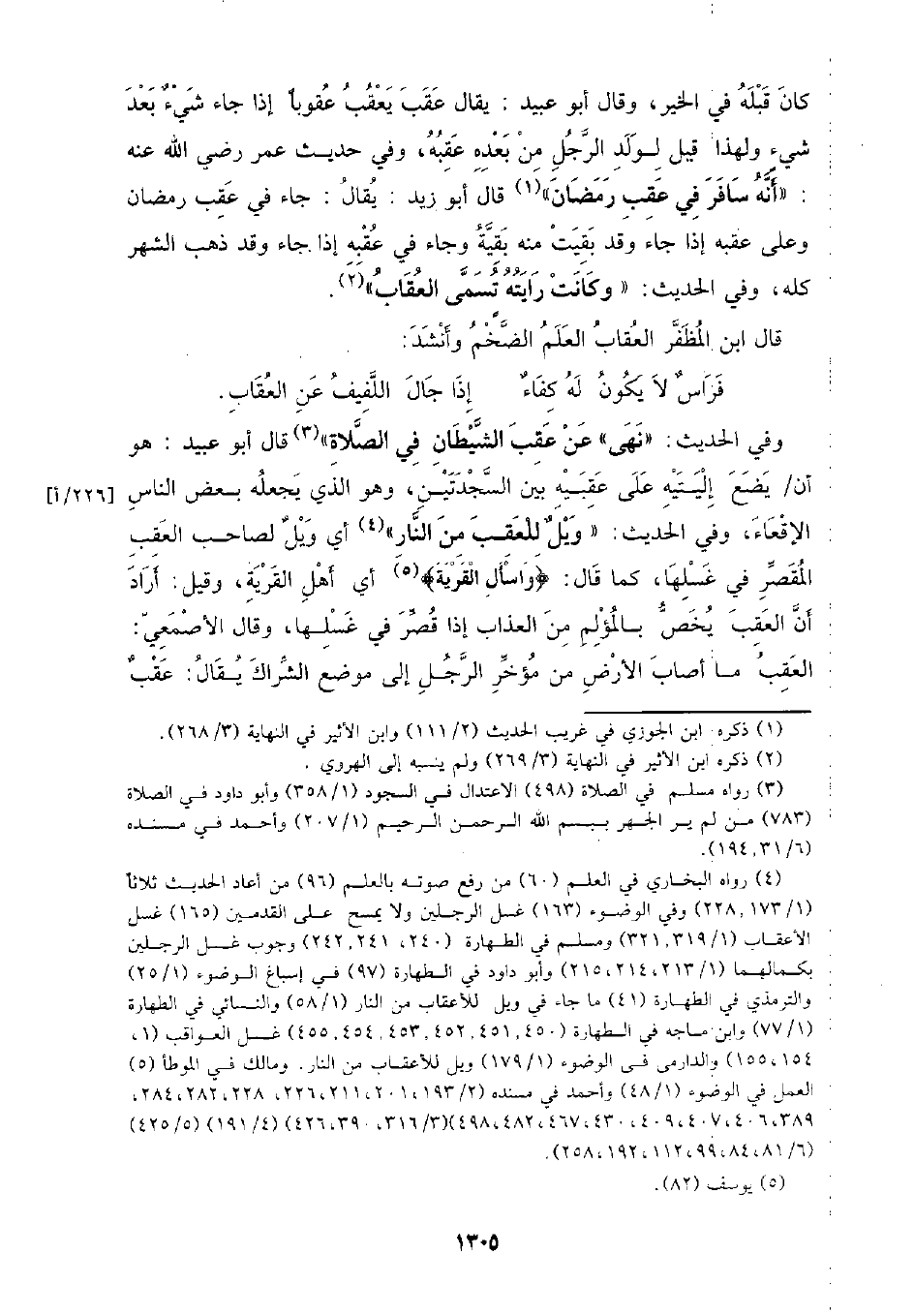 وفي الحديث: (نهى) عن عقب الشيطان في الصلاة) قال أبو عبيد: هو أن/ يضع إليتيه على عقبيه بين السجدتين، وهو الذي يجعله بعض الناس الإقعاء، وفي الحديث: (ويل للعقب من النار) أي ويل لصاحب العقب المقصر في غسلها، كما قال: {واسأل القرية} أي أهل القرية، وقل: أراد أن العقب يخص بالمؤلم من العذاب إذا قصر في غسلها، وقال الأصمعي: العقب ما أصاب الأرض من مؤخر الرجل إلى موضع الشراك يقال: عقب