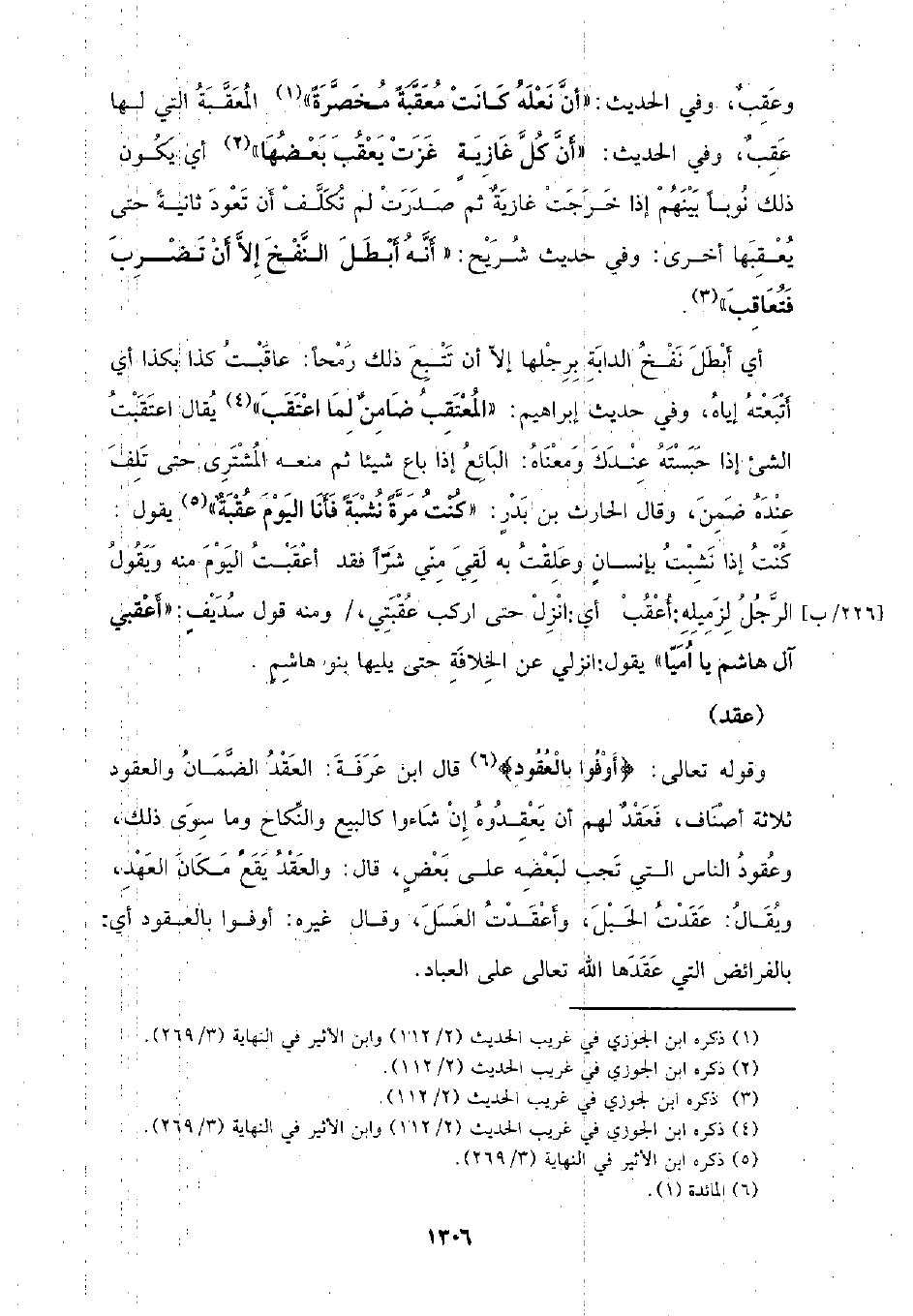 وعقب، وفي الحديث: (أن نعله كانت معقبة مخصرة) المعقبة التي لها عقب، وفي الحديث: (أن كل غازية غزت يعقب بعضها) أي يكون ذلك نوبا بينهم إذا خرجت غازية ثم صدرت لم تكلف أن تعود ثانية حتى يعقبها أخرى: وفي حديث شريح: (أنه أبطل النفخ إلا أن تضرب فتعاقب).