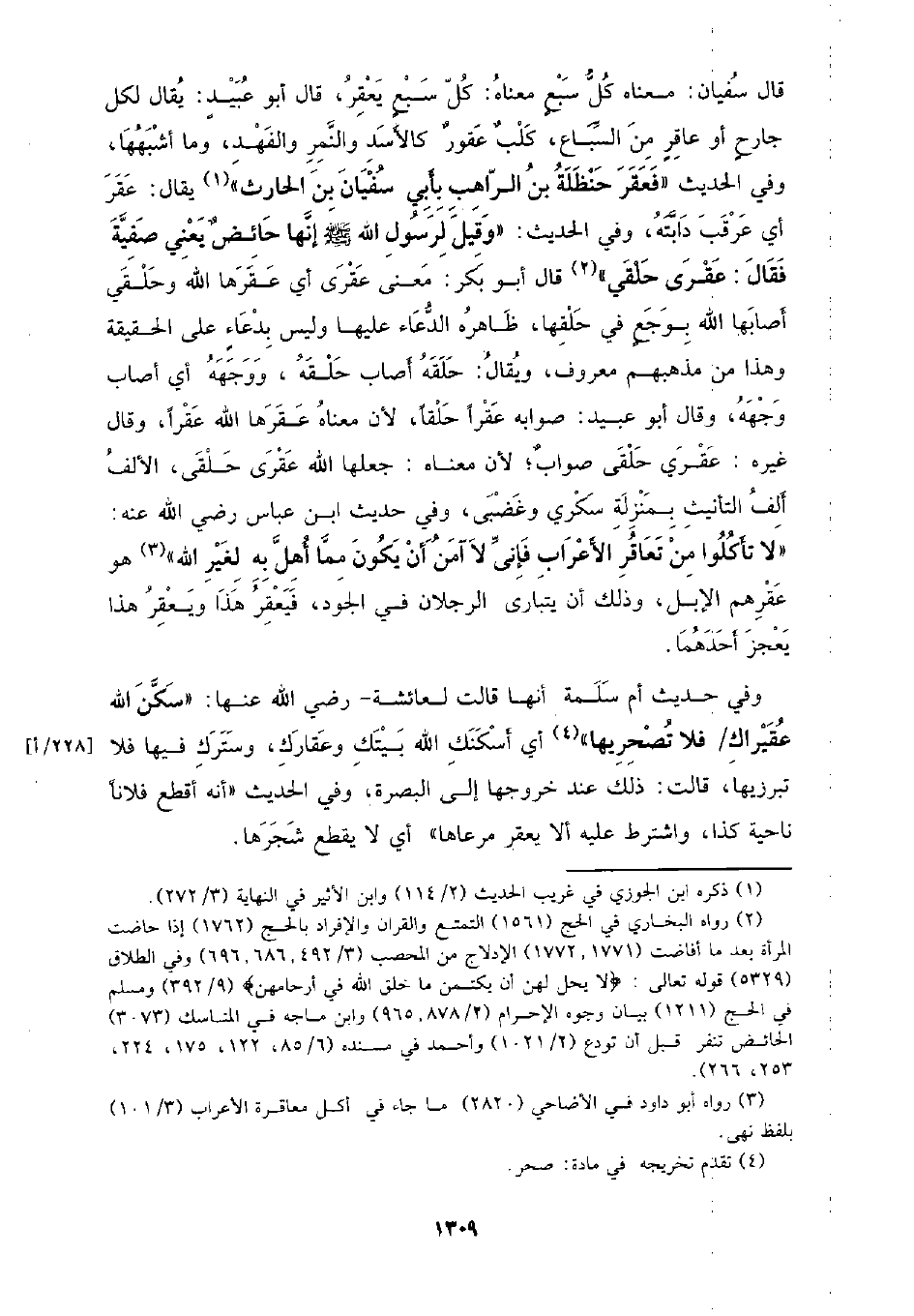قال سفيان: معناه كل سبع معناه: كل سبع يعقر، قال أبو عبيد: يقال لكل جارح أو عاقر من السباع، كلب عقور كالأسد والنمر والفهد، وما أشبهها، وفي الحديث (فعقر حنظلة بن الراهب بأبي سفيان بن الحارث) يقال: عقر أي عرقب دابته، وفي الحديث: (وقيل لرسول الله - صلى الله عليه وسلم - إنها حائض يعني صفية فقال: عقرى حلقي) قال أبو بكر: معنى عقرى أي عقرها الله وحلقي أصابها الله بوجع في حلقها، ظاهره الدعاء عليها وليس بدعاء على الحقيقة وهذا من مذهبهم معروف، ويقال: حلقه أصاب حلقه، ووجهه أي أصاب وجهه، وقال أبو عبيد: صوابه عقرا حلقا، لأن معناه عقرها الله عقرا، وقال غيره: عقري حلقى صواب؛ لأن معناه: جعلها الله عقرى حلقى، الألف ألف التأنيث بمنزلة سكري وغضبى، وفي حديث ابن عباس رضي الله عنه: (لا تأكلوا من تعاقر الأعراب فإني لا آمن أن يكون مما أهل به لغير الله) هو عقرهم الإبل، وذلك أن يتبارى الرجلان في الجود، فيعقر هذا ويعقر هذا يعجز أحدهما.