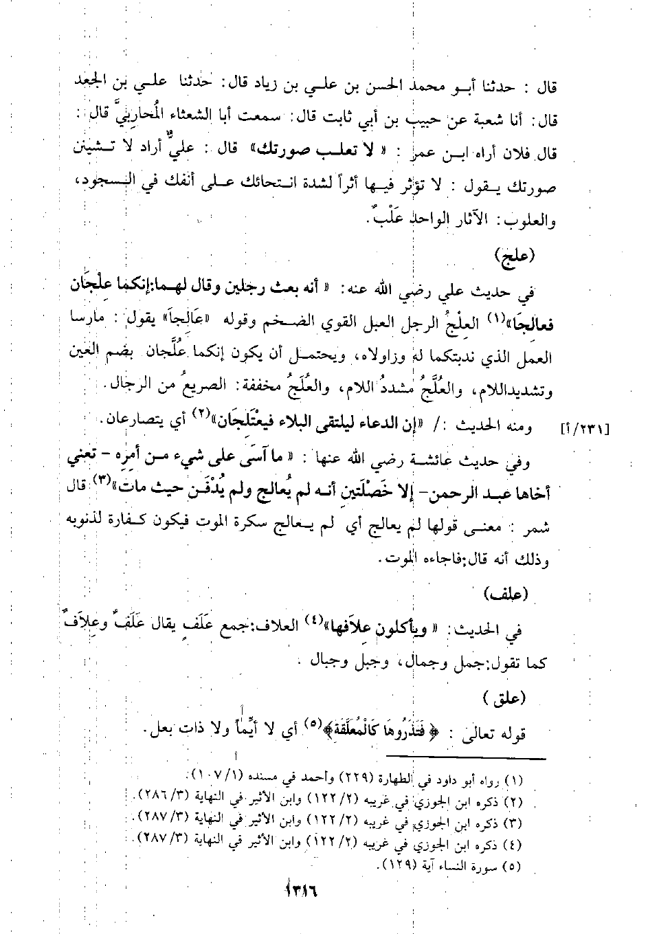 قال: حدثا أبو محمد الحسن بن علي بن زياد قال: حدثنا علي بن الجعد قال: أنا شعبة عن حبيب بن أبي ثابت قال: سمعت أبا الشعثاء المحاربي قال: قال فلان أراه ابن عمر: (لا تعلب صورتك) قال: علي أراد لا تشينن صورتك بقول: لا تؤثر فيها أثرا لشدة انتحائك على أنفك في السجود، والعلوب: الآثار الواحد علب.