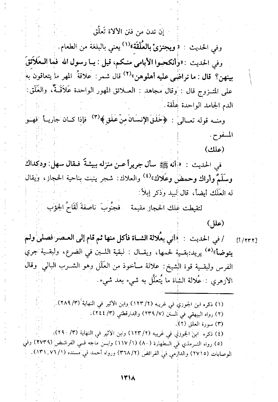 / في الحديث: (أتي بعلالة الشاة فأكل منها ثم قام إلى العصر فصلى ولم يتوضأ) يريد: بقية لحمها، ويقال: لبقية اللبن في الضرع، ولبقية جري الفرس ولبقية قوة الشيخ: علالة مأخوذ من العلل وهو الشرب البالي وقال الأزهري: عاللة الشاة ما يتعلل به شيء بعد شيء.