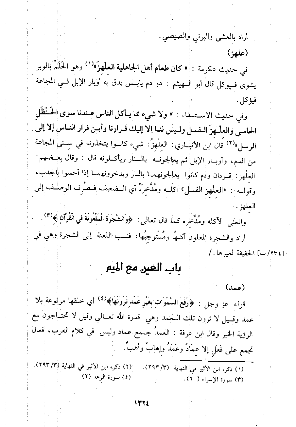 قوله عز وجل: {رفع السموات بغير عمد ترونها} أي خلقها مرفوعة بلا عمد وقيل لا ترون تلك العمد وهي قدرة الله تعالى وقيلا لا تحتاجون مع الرؤية الخبر وقال ابن عرفة: العمد جمع عماد وليس في كلام العرب، فعال تجمع على فعل إلا عماد وعمد وإهاب وأهب.