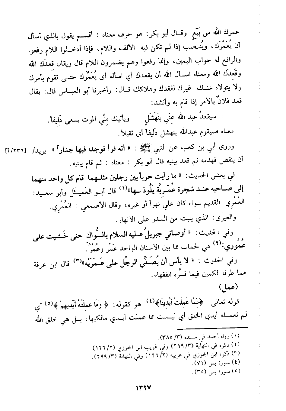 وفي الحديث: (لا بأس أن يصلي الرجل على عمريه) قال ابن عرفة هما طرفا الكمين فيما فسره الفقهاء.