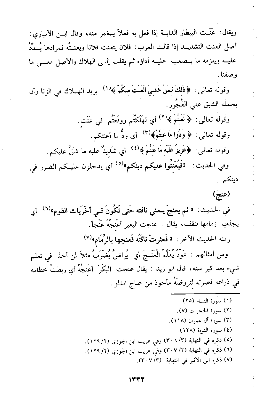 وفي الحديث: (فيعنتوا عليكم دينكم) أي يدخلون عليكم الضرر في دينكم.