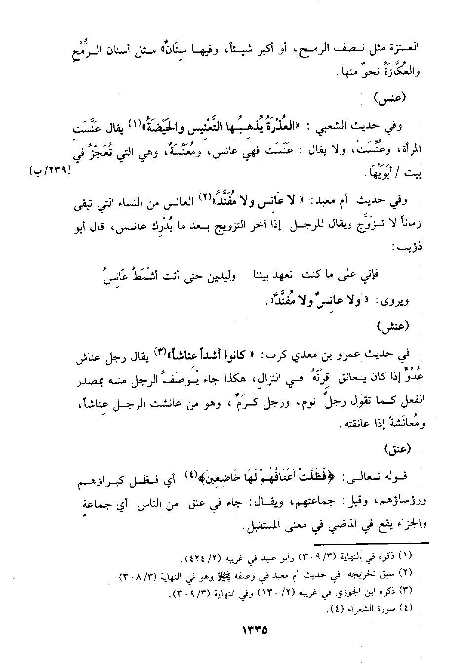 وفي حديث الشعبي: (العذرة يذهبها التعنيس والحيضة) يقال عنست المرأة، وعنست، ولا يقال: عنست فهي عانس، ومعنسة، وهي التي تعجز في بيت /أبويها.