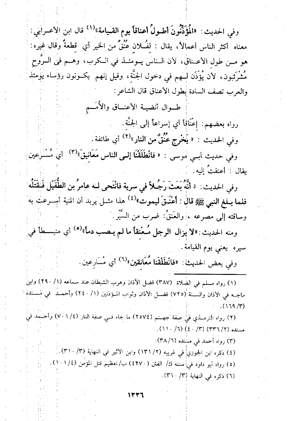 وفي الحديث: (المؤذنون أطول أعناقا يوم القيامة) قال ابن الأعرابي: معناه أكثر الناس أعمالا، يقال: للفلان عنق من الخير أي قطعة وقال غيره: هو من طول الأعناق، لأن الناس يومئذ في الكرب، وهم في الروح مشرئبون، لأن يؤذن لهم في دخول الجنة، وقيل إنهم يكونون رؤساء يومئذ والعرب تصف السادة بطول الأعناق قال الشاعر: