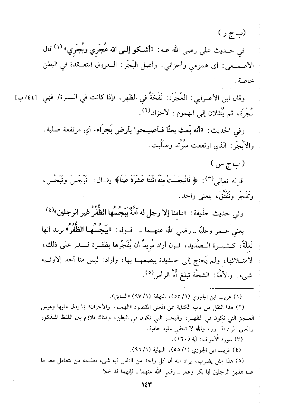 وقال ابن الأعرابي: العجرة: نفخة في الظهر، فإذا كانت في السرة/ فهي بجرة، ثم ينقلان إلى الهموم والأحزان.