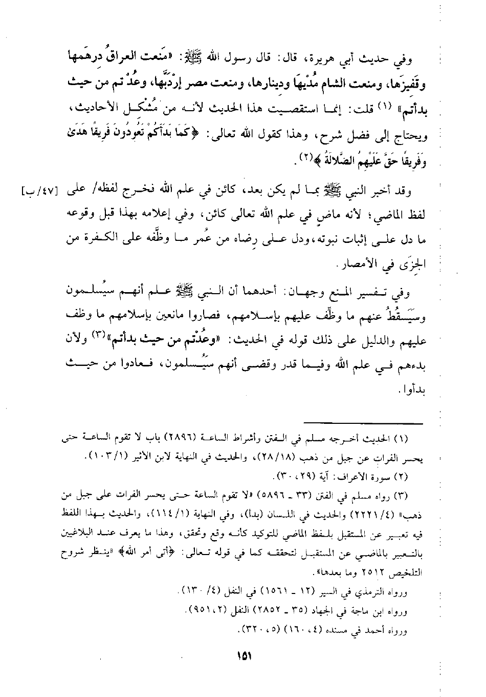 وفي حديث أبي هريرة، قال: قال رسول الله - صلى الله عليه وسلم -: (منعت العراق درهمها وقفيزها، ومنعت الشام مديها ودينارها، ومنعت مصر إردبها، وعدتم من حيث بدأتم) قلت: إنما استقصيت هذا الحديث لأنه من مشكل الأحاديث، ويحتاج إلى فضل شرح، وهذا كقوله الله تعالى: {كما بدأكم تعودون فريقًا هدى وفريقًا حق عليهم الضلالة}.