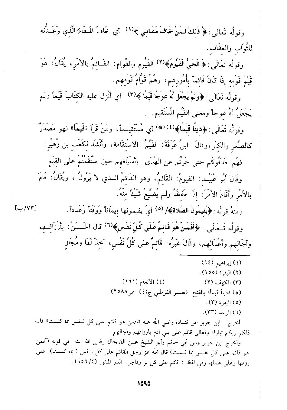 وقوله تعالى: {دينا قيما} أي مستقيما، ومن قرأ (قيما) فهو مصدر كالصغر والكبر، وقال: ابن عرفة: القيم: الاستقامة، وأنشد لكعب بن زهير فهم حدفوكم حتى جرتم عن الهدى بأسيافهم حين استقمتم على القيم وقال أبو عبيد: القيوم: القائم، وهو الدائم الذي لا يزول، ويقال: قام بالأمر وأقام الأمر: إذا حفظه ولم يضيع شيئا منه.