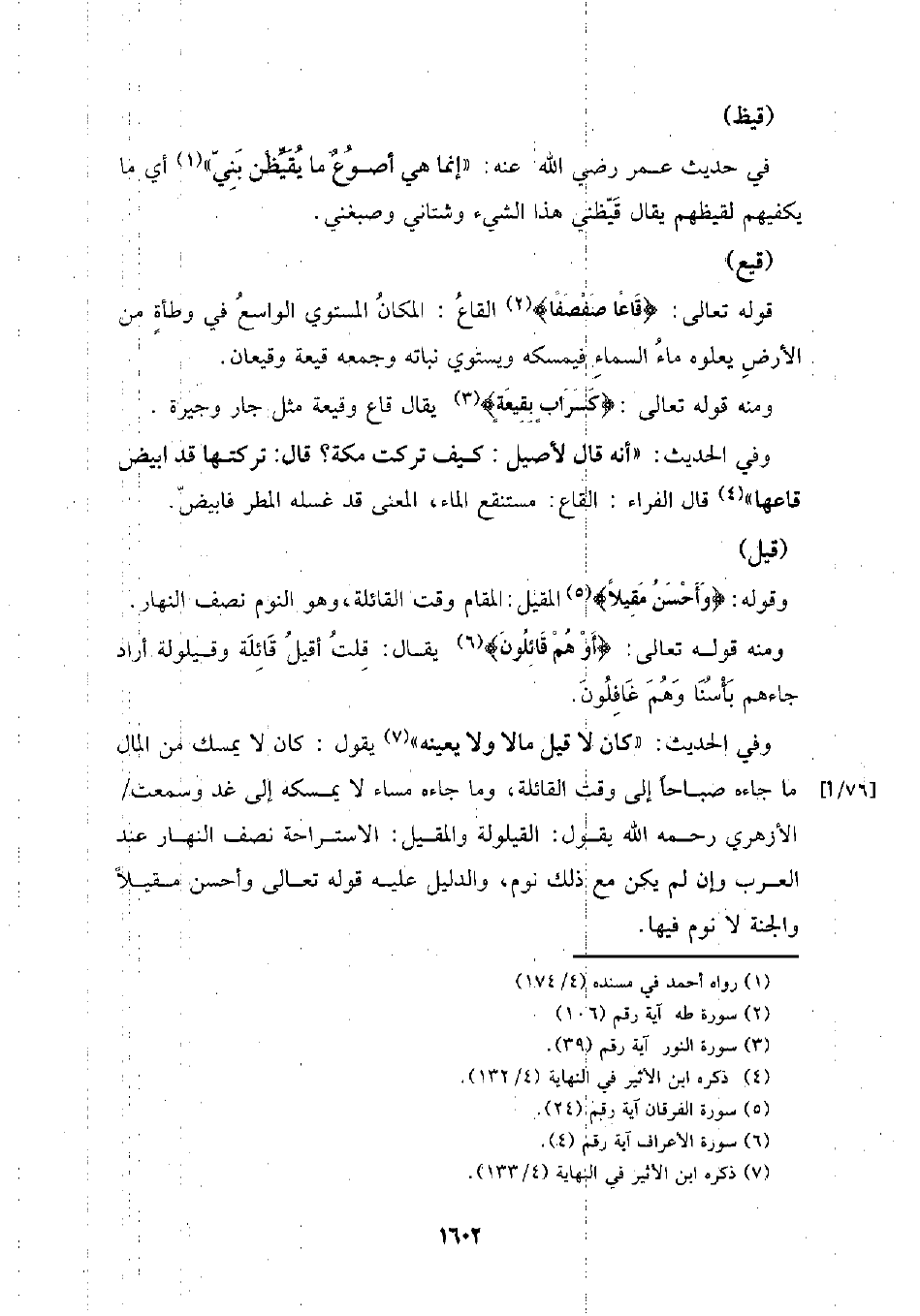 وفي الحديث: (كان لا قيل مالا ولا يعينه) يقول: كان لا يمسك من المار ما جاءه صباحا إلى وقت القائلة، وما جاءه مسار لا يمسكه إلى غد وسمعت الأزهري رحمه الله يقول: القيلولة والمقيل: الاستراحة نصف النهار عند العرب وإن لم يكن مع ذلك نوم، والدليل على قوله تعالى أحسن مقيلا والجنة لا نوم فيها.