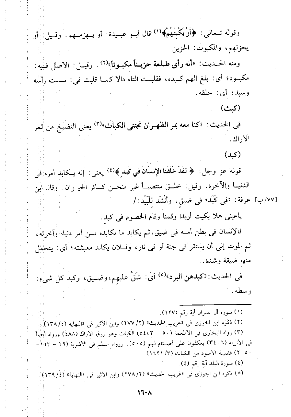 ومنه الحديث: (أنه رأى طلعة حزينا مكبوتا). وقيل: الأصل فيه: مكبود؛ أي: بلغ الهم كبده، فقلبت التاء دالا كما قلبت في: سبت رأسه وسبد؛ أي: حلقه.