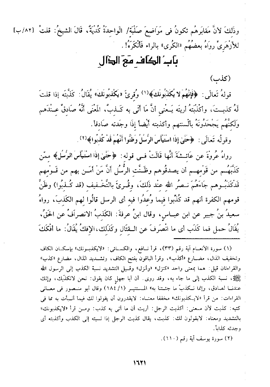 رواه عروة عن عائشة أنها قالت في قوله: {حتى إذا استيأس الرسل} ممن كذبهم من قومهم أن يصدقوهم وظنت الرسل أن من أمن بهم من قومهم قد كذبوهم جاءهم نصر الله عند ذلك، وقرئ بالتخفيف (قد كذبوا) وظن قومهم الكفرة أنهم قد كذبوا فيما وعدوا فيه أي الرسل قالوا لهم الكذب، رواه سعيد بن جبير عن ابن عباس، وقال ابن عرفة: الكذب الانصراف عن الحق، يقال حمل فما كذب أي ما انصرف عن القتال وكذلك، الإفك يقال: ما أفكك