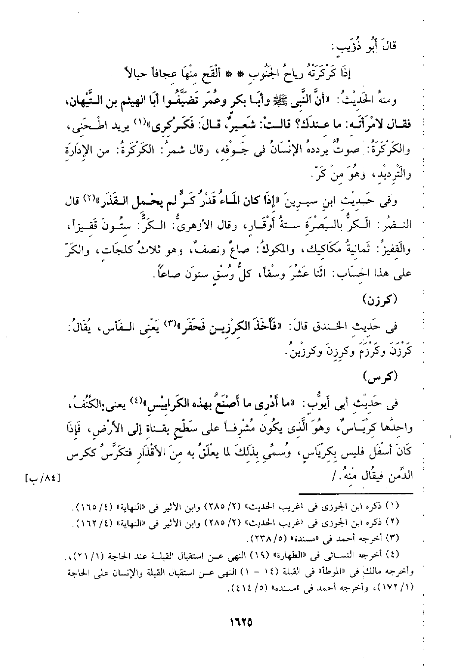 وفي حديث ابن سيرين (إذا كان لماء قدر كر لم يحمل القدر) قال النضر: الكر بالبصرة ستة أوقار، وقال الأزهري: الكر: ستون قفيزا، والقفيز: ثمانية مكاكيك، والمكوك: صاع ونصف، وهو ثلاث كلجات، والكر على هذا الحساب: اثنا عشر وسقا، كل وسق ستون صاعا.