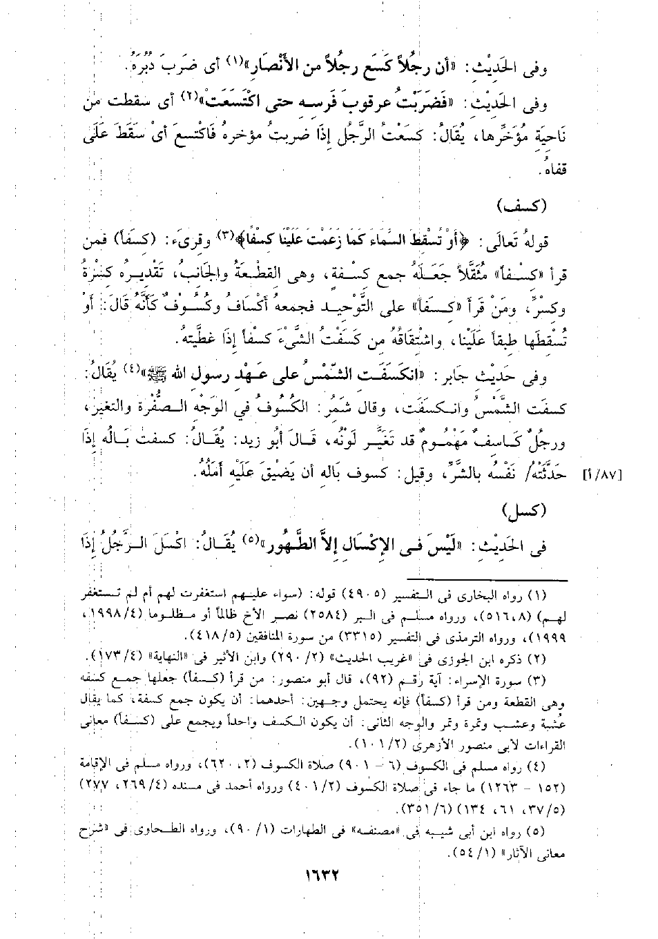 وفي حديث جابر: (انكسفت الشمس على عهد رسول الله - صلى الله عليه وسلم -) يقال: كسفت الشمس وانكسفت، وقال شمر: الكسوف في الوجه الصفرة والتغير، ورجل كاسف مهموم قد تغير لونه، قال أبو زيد: يقال: كسفت باله إذا حدثته نفسه بالشر، وقيل: كسوف باله أن يضيق عليه أمله.