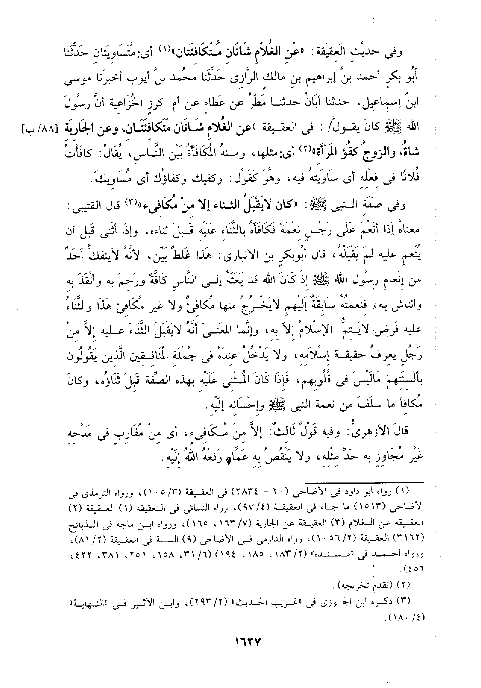 وفي حديث العقيقة: (عن الغلام شاتان متكافئتان) أي: متساويتان حدقنا أبو بكر أحمد بن إبراهيم بن مالك الرازي حدقنا محمد بن أيوب أخبرنا موسى ابن إسماعيل، حدثنا أبان حدثنا مطر عن عطاء عن أم كرز الخزاعية أن رسول الله - صلى الله عليه وسلم - كان يقول: في العقيقة (عن الغلام شاتان متكافئتان، وعن الجارية شاة، والزوج كفؤ المرأة) أي: مثلها، ومنه المكافأة بين الناس، يقال: كافأت فلانا في فعله أس ساويته فيه، وهو كقول: وكفيك وكفاؤك أي مساويك.