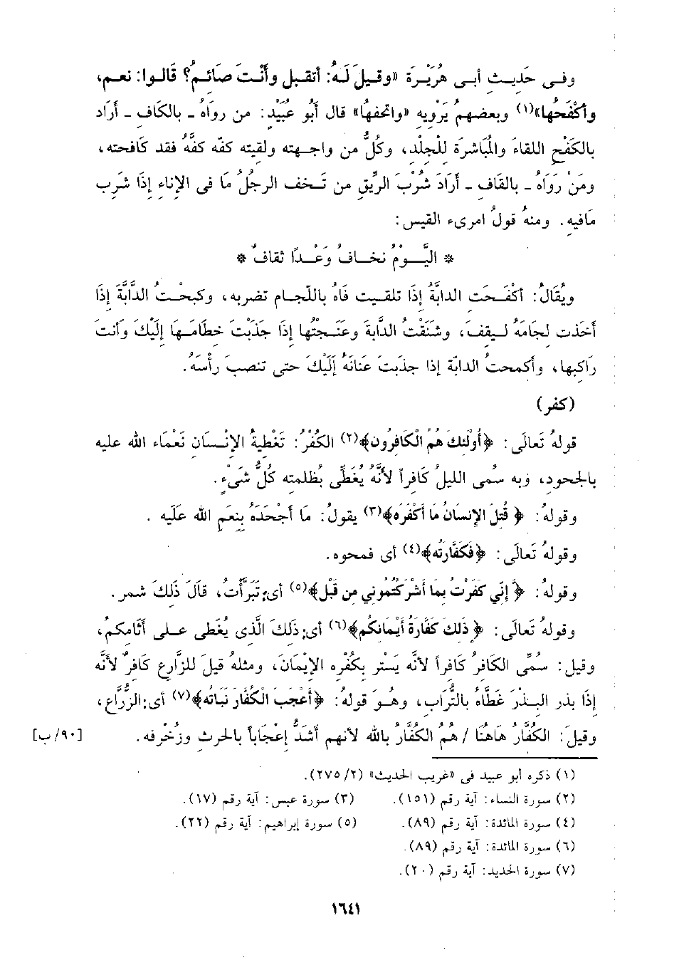 وفي حديث أبي هريرة (وقيل له: أتقبل وأنت صائم؟ قالوا: نعم، وأكفحها) وبعضهم يرويه (واتحفها) قال أبو عبيد: من رواه- بالكاف- أراد بالكفح اللقاء والمباشرة للجلد، وكل من واجهته ولقيته كفه كفه فقد كافحته، ومن رواه- بالقاف- أراد شرب الريق من تخف الرجل ماا في الإناء إذا شرب ما فيه. ومنه قول امرئ القيس