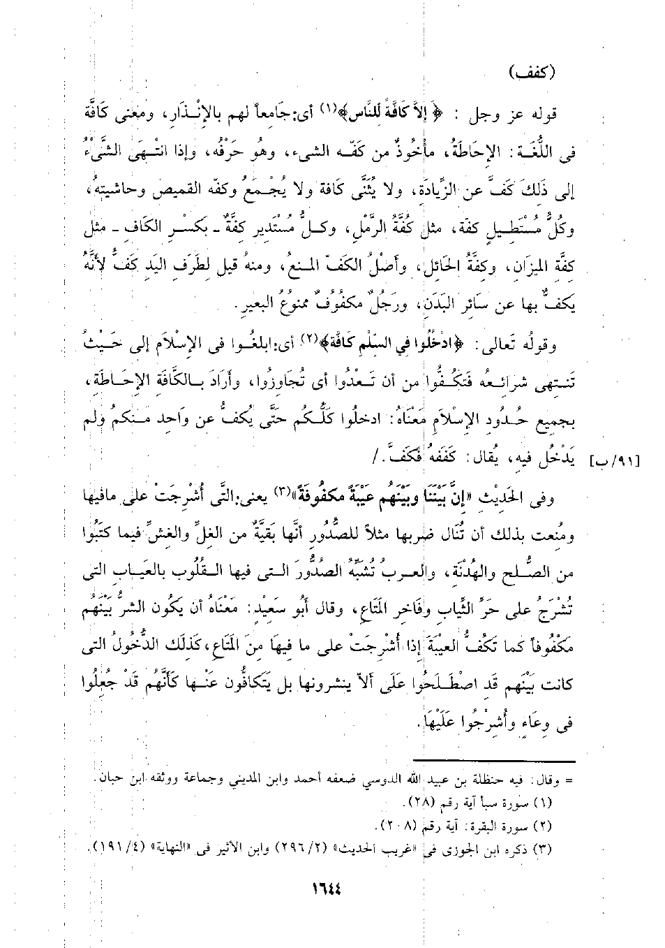 وقوله تعالى: {ادخلوا في السلم كافة} أي: ابلغوا في الإسلام إلى حيث تنتهى شرائعه فتكفوا من أن تعدوا أي تجاوزوا، وأراد بالكافة الإحاطة، بجميع حدود الإسلام معناه: ادخلوا كلكم حتى يكف عن واحد منك ولم يدخل فيه، يقال: كففه فكف.