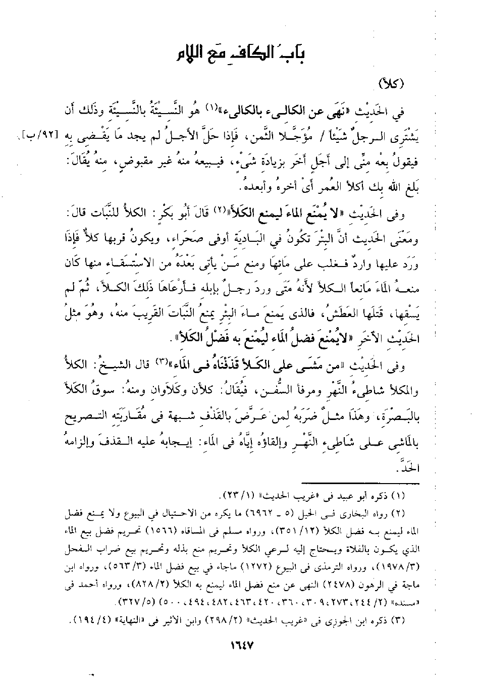 وفي الحديث (لا يمنع الماء ليمنع الكلأ) قال أبو بكر: الكلأ للنبات قال: ومعنى الحديث أن البئر تكون في البادية أو في صحراء، ويكون قربها كلأ فإذا ورد ع ليها وارد فغلب على مائها ومنه من يأتي بعده من الاستسقاء منها كان منعه الماء مانعا الكلأ لأنه متى ورد رجلا بإبله فأرعاها ذلك الكلأ، ثم لم يسقها، قتلها العطش، فالذي يمنع ماء البئر يمنع النبات القريب منه، وهو مثل الحديث الآخر (لا يمنع فضل الماء ليمنع به فضل الكلأ).