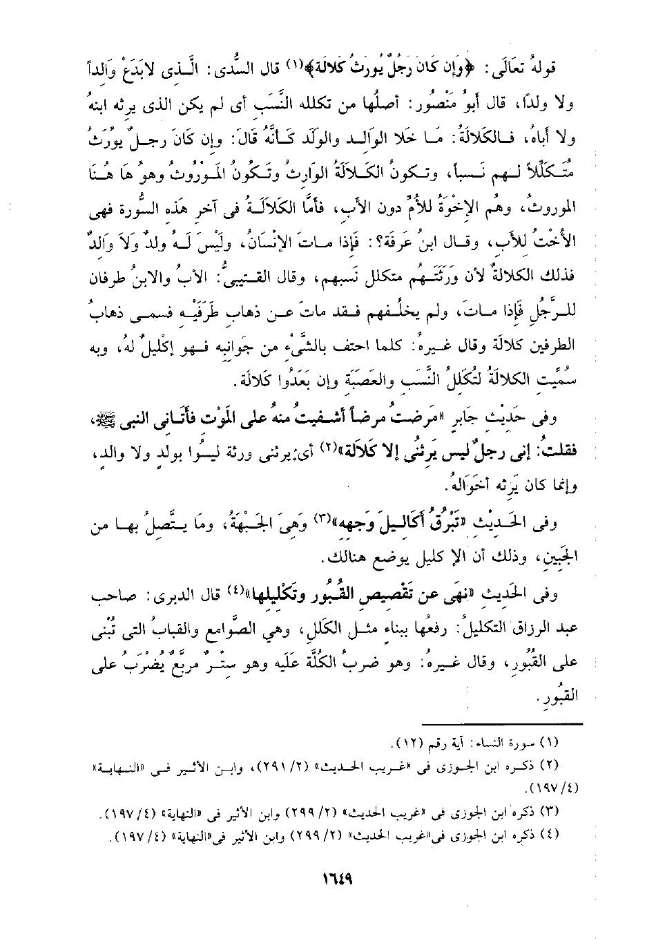 وفي الحديث (نهى عن تقصيص القبور وتكليلها) قال الدبري: صاحب عبد الرزاق التكليل: رفعها ببناء مثل الله، وهي الصوامع والقباب التي تبنى على القبور، وقال غيره: وهو ضرب الكلة عليه وهو ستر مربع يضرب على القبور.