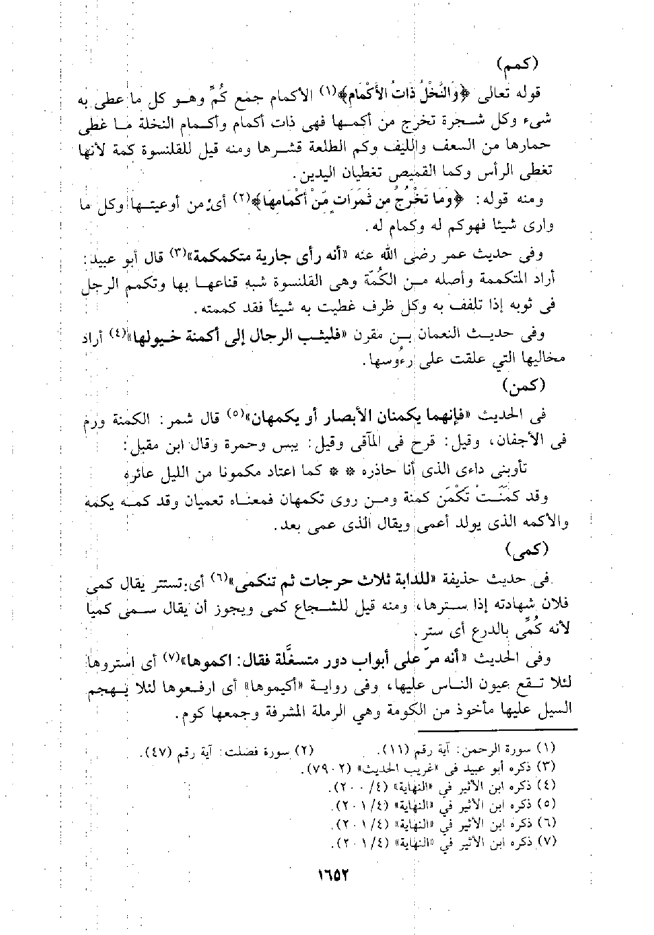 قوله تعالى: {والنخل ذات الأكمام} الأكمام جمع كم وهو كل ما عطى به شيء وكل شجرة تخرج من أكمها فهي ذات أكمام وأكمام النخلة ما غطى حمارها من السعف والليف وكم الطلعة فشرها ومنه قيل للقلنسوة كمة لأنها تغطى الرأس وكما القميص تغطيان اليدين.