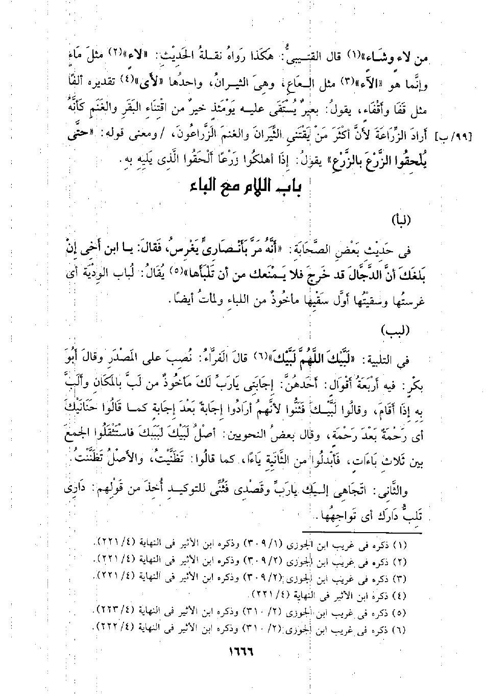 في التلبية (لبيك اللهم لبيك) قل الفراء: نصب على المصدر وقال أبو بكر: فيه أربعة أقوال: أحدهن: إجابتي يا رب لك مأخوذ من لب بالمكان وألب به إذا أقام، وقالوا لبيك فثنوا لأنهم أرادوا إجابة بعد إجابة كما قالوا حنانيك أي رحمة بعد رحمة، وقال بعض النحويين: أصل لبيك لبببك فاستثقلوا الجمع بين ثلاث باءات، فأبدلوا من الثانية ياءا، كما قالوا: تظنيت، والأصل تظننت.