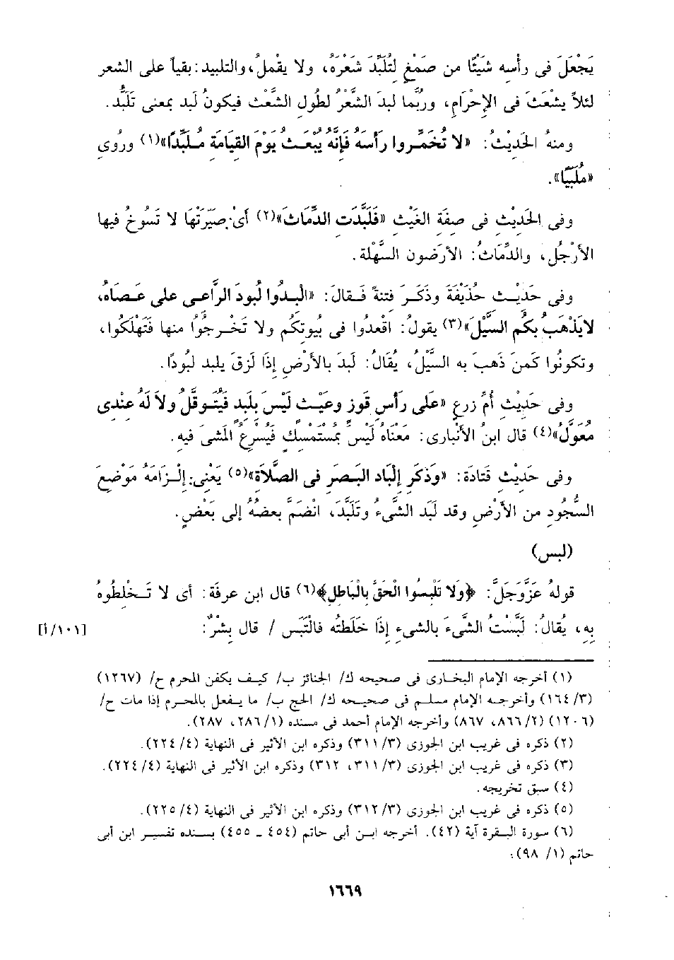 ومنه الحديث: (لا تخمروا رأسه فإنه يبعث يوم القيامة ملبدا) ومروى (ملبيا).