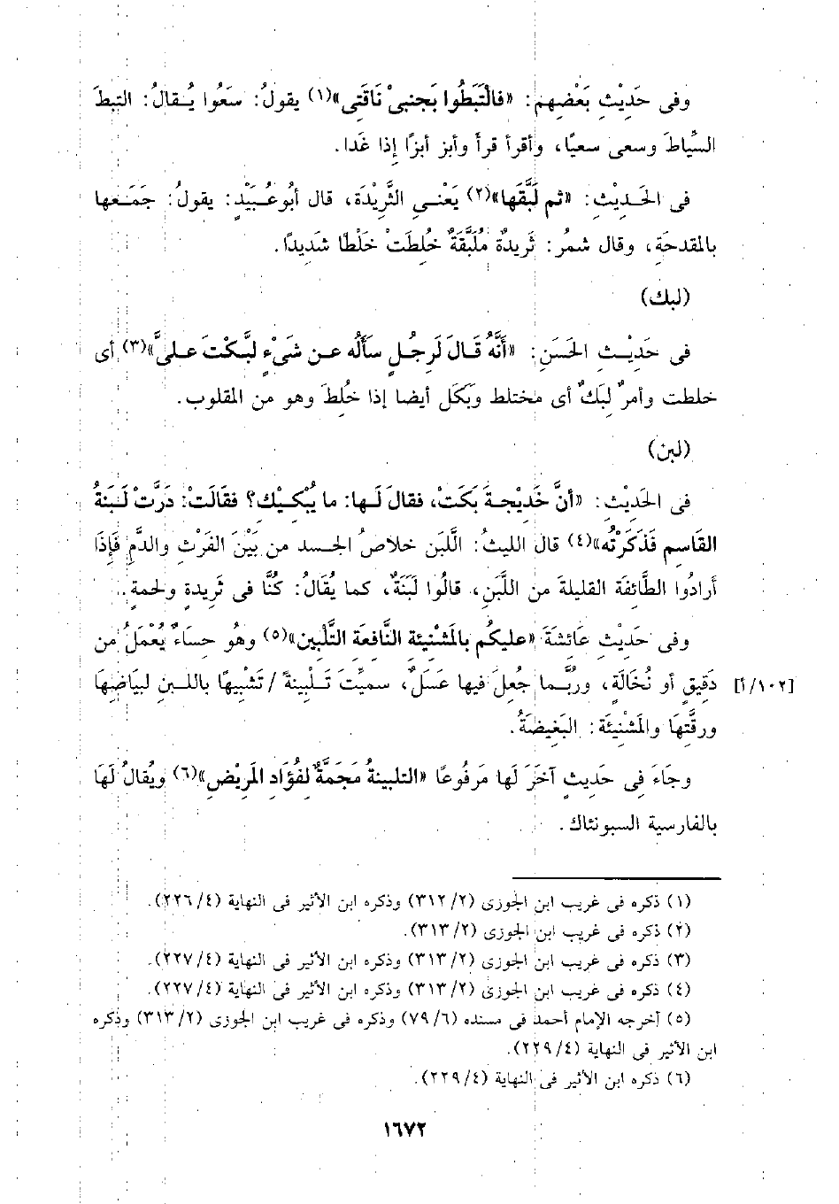 في الحديث: (أن خديجة بكت، فقال لها: ما يبكيك؟ فقالت: درت لبنة القاسم فذكرته) قال الليث: اللبن خلاص الجسد من بين الفرث والدم فإذا أرادوا الطائفة القليلة من اللبن، قالوا لبنة، كما يقال: كنا في ثريدة ولحمة.