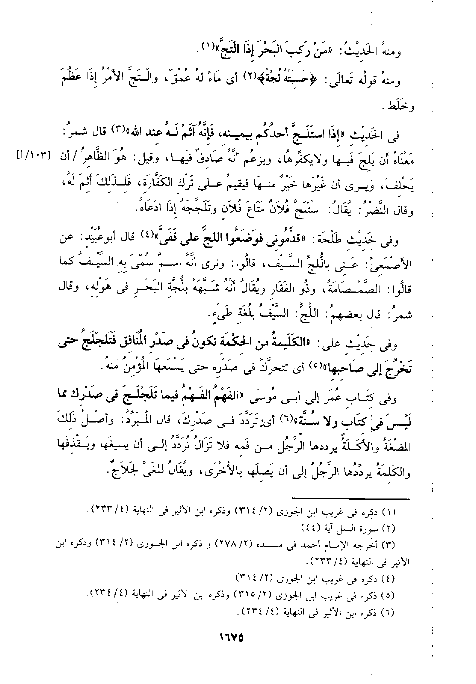 وفي حديث طلحة: (قدموني فوضعوا اللج على قفى) قال أبو عبيد: عن الأصمعي: عني باللج السيف، قالوا: ونرى أنه اسم سمي به السيف كما قالوا: الصمصامة، وذو الفقار ويقال أنه شبهه يلجة البحر في هوله، وقال شمر: قال بعضهم: اللج: السيف بلغة طئ.