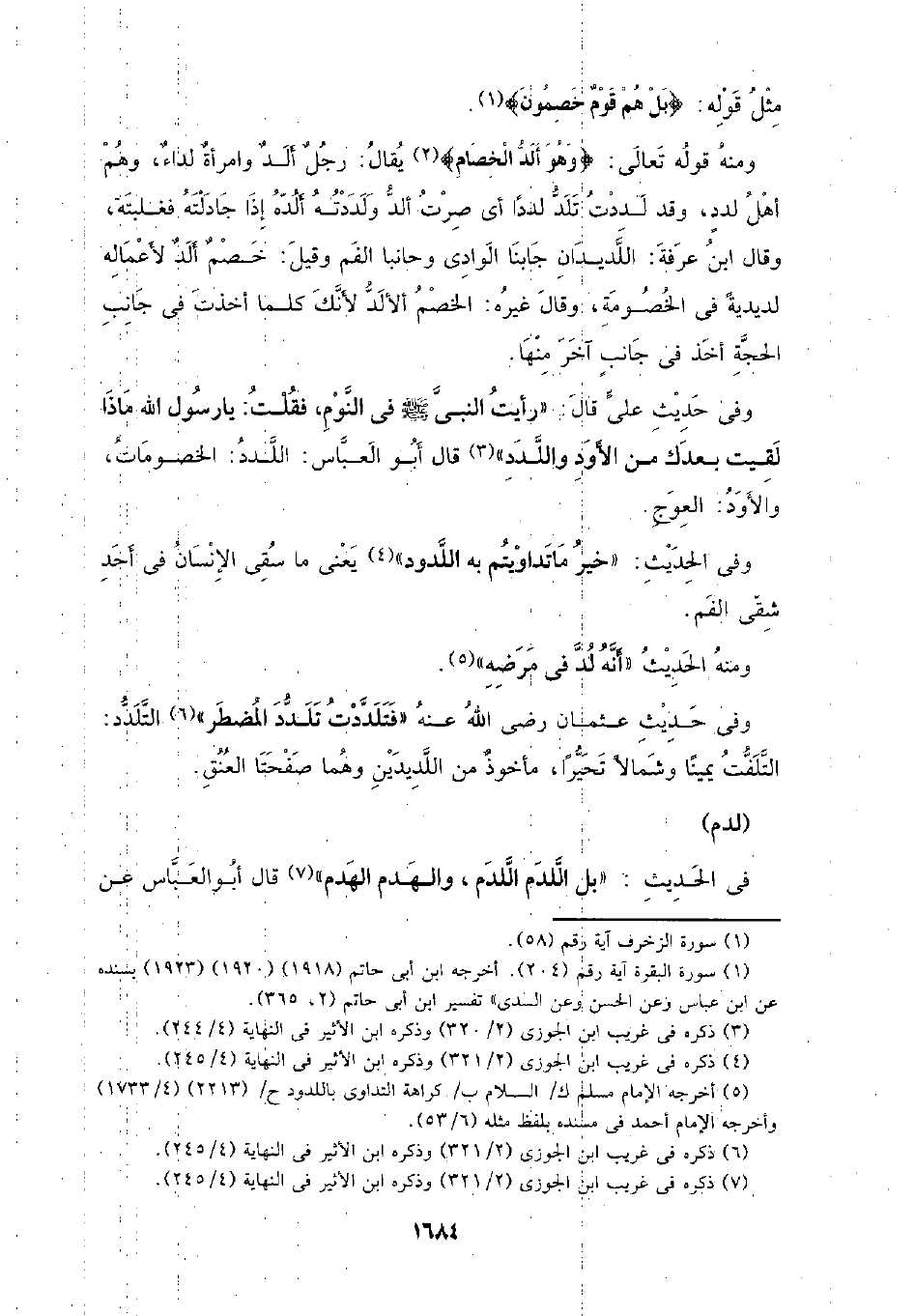 وفي الحديث على قال: (رأيت النبي - صلى الله عليه وسلم - في النوم، فقلت: يا رسول الله ماذا لقيت بعدك من الأود واللدد) قال أبو العباس: اللدد: الخصومات، والأود: العوج.