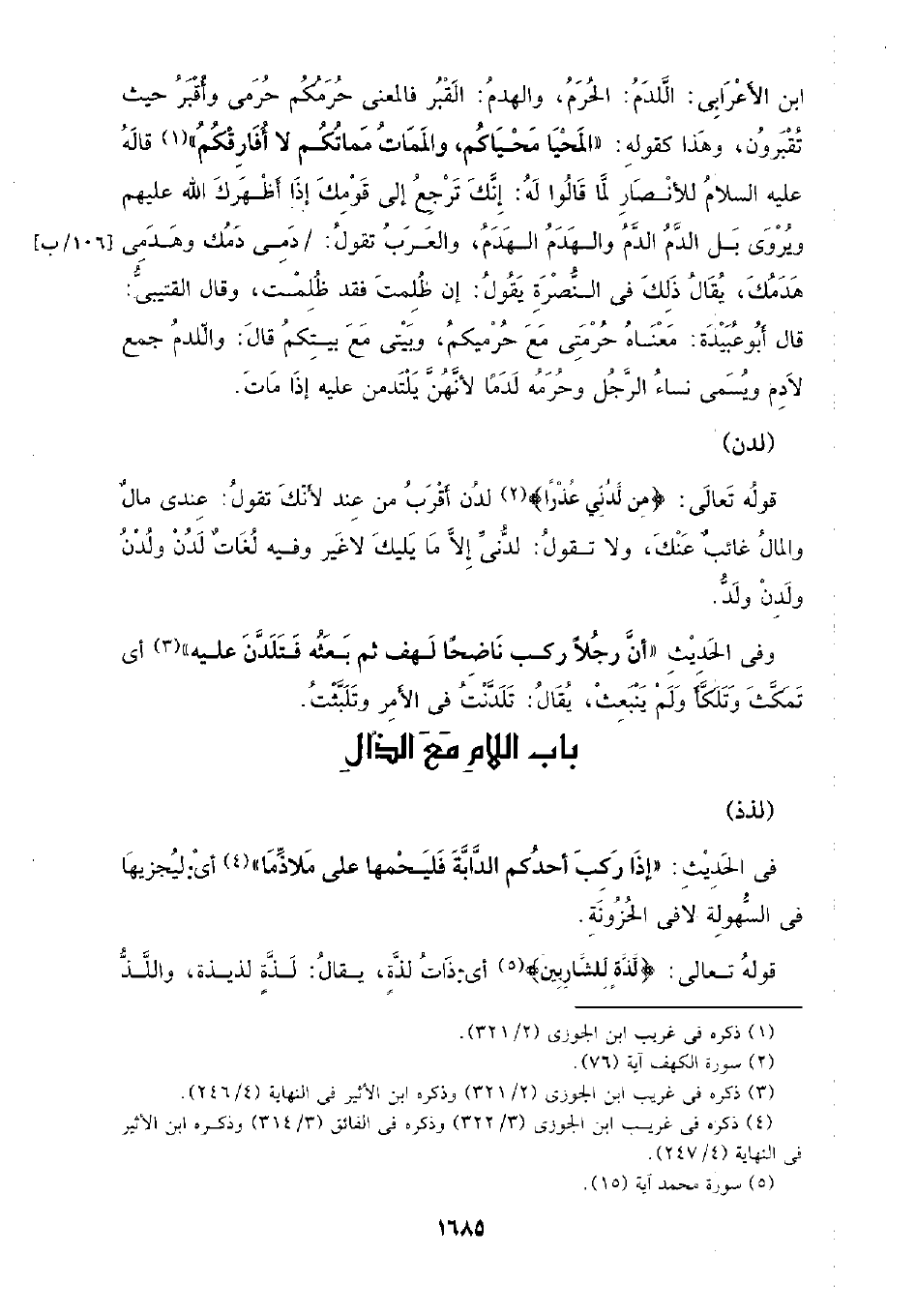 ابن الأعرابي: اللدم: الحرم، والهدم: القبر فالمعنى حركم حرمى وأقبر حيث تقبرون، وهذا كقوله: (المحيا محياكم، والممات مماتكم لا أفارقكم) قاله عليه السلام للأنصار لما قالوا له: إنك ترجع إلى قومك إذا أظهرك الله عليهم ويروى بل الدم الدم والهدم الهدم، والعرب تقول: دمي دمك وهدمي هدمك، يقال ذلك في النصرة يقول: إن ظلمت فقد ظلمت، وقال القتيبي: قال أبو عبيدة: معناه حرمتي مع حرميكم، وبيتي مع بيتكم قال: واللدم جمع لآدم ويسمى نساء الرجل وحرمه لدما لأنهن يلتدمن عليه إذا مات.