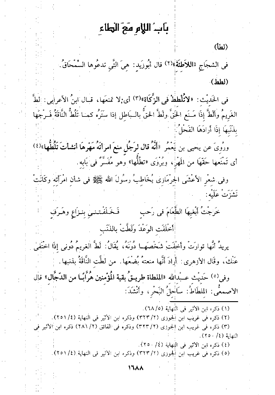وروى عن يحيى بن يعمر (أنه قال لرجل منه امرأته مهرها أنشأت تلطها) أي تمنعها حقها من المهر، ويروى (تطلها) وهو مفسر في بابه.