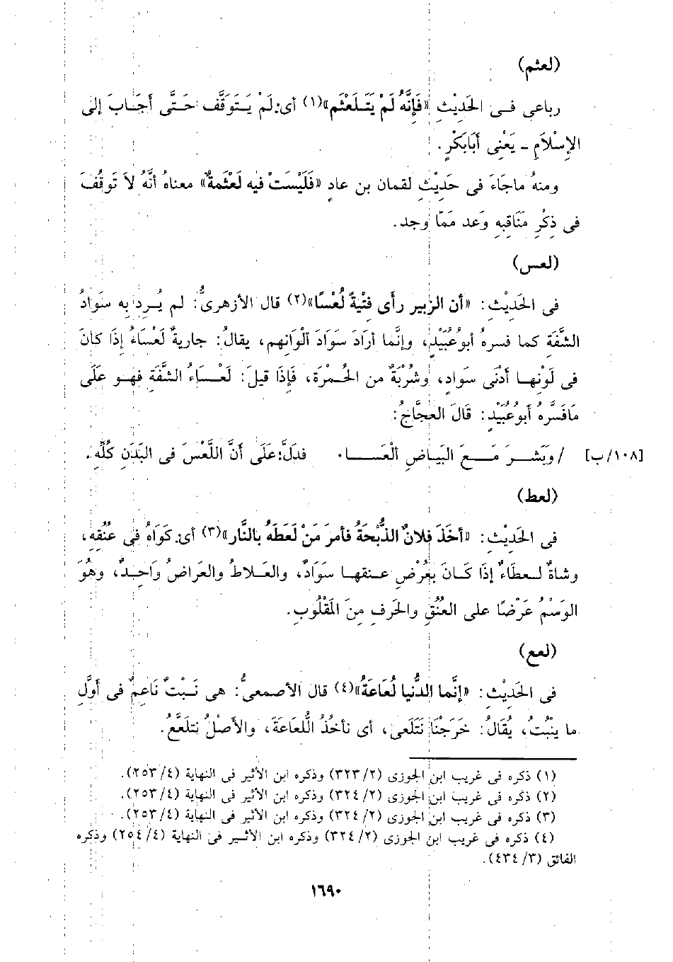 في الحديث: (أخذ فلان الذبحة فأمر من لعطه بالنار) أي: كواه في عنقه، وشاة لعطاء إذا كان بعرض عنقها سواد، والعلاط والعراض واحد، وهو الوسم عرضا على العنق والحرف من المقلوب.