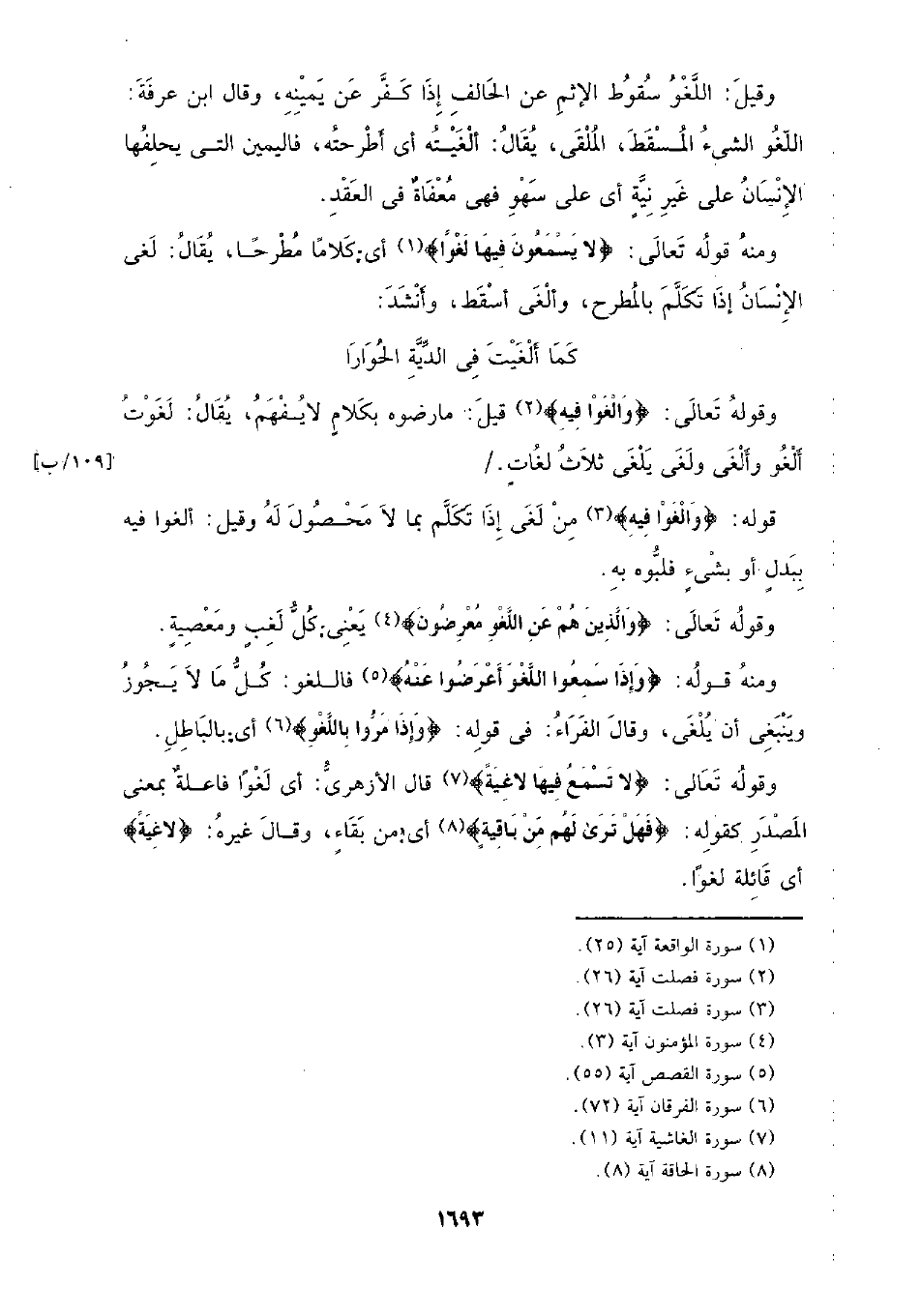 ومنه قوله: {وإذا سمعوا اللغو أعرضوا عنه} فاللغو: كل ما يجوز وينبغي أن يلغى، وقال الفراء: في قوله: {وإذا مروا باللغو} أي: بالباطل.