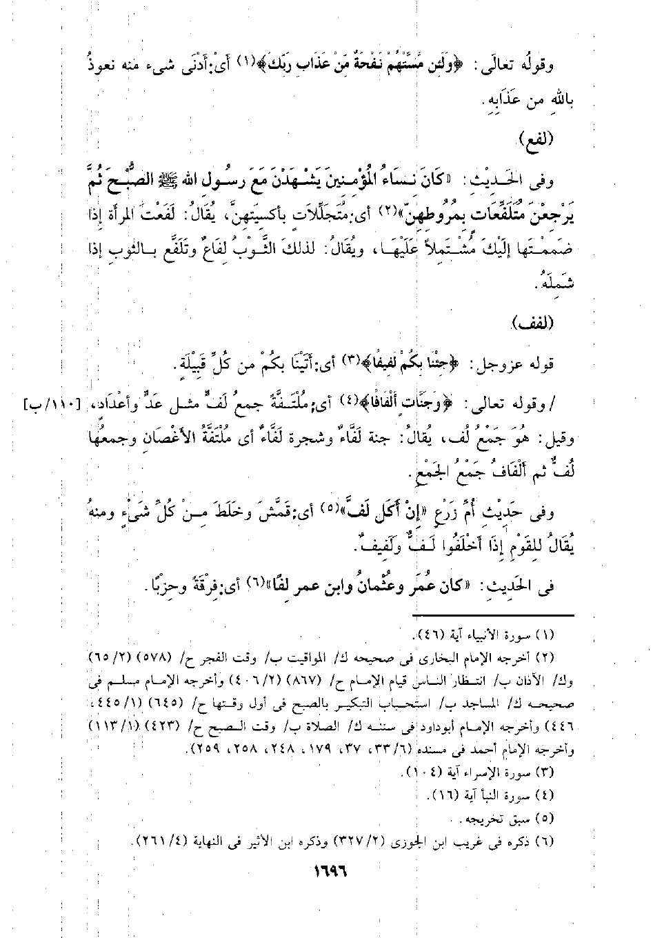 وفي الحديث: (كان نساء المؤمنين يشهدن مع رسول الله - صلى الله عليه وسلم - الصبح ثم يرجعن متلفعات بمروطهن) أي: متجللات بأكسيتهن، يقال: لفعت المرأة إذا ضممتها إليك مشتملا عليها، ويقال: لذلك الثوب لفاع وتلفع بالثوب إذا شمله.