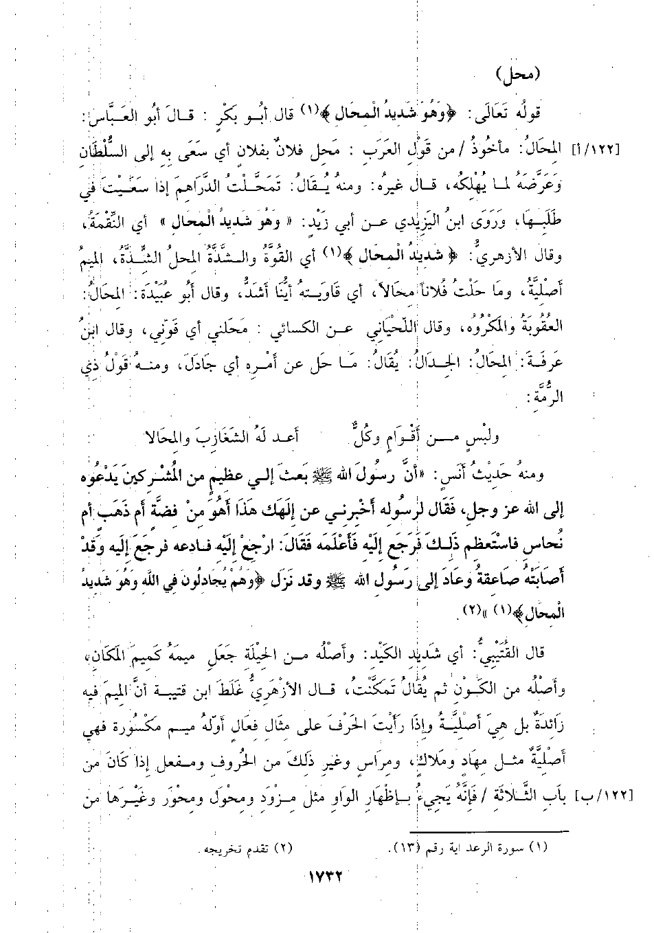 قوله تعالى: {وهو شديد المحال} قال أبو بكر: قال أبو العباس: المحال: مأخوذ من قول العرب: محل فلان بفلان أي سعى به إلى السلطان وعرضه لما يهلكه، قال غيره: ومنه يقال: تمحلت الدراهم إذا سعيت في طلبها، وروى ابن اليزيدي عن أي زيد: (وهو شديد المحال) أي النقمة، وقال الأزهري: {شديد المحال} أي القوة والشدة المحل الشدة، الميم أصلية، وما حلت فلانا محالا، أي قاويته أينا أشد، وقال أبو عبيدة: المحال: العقوبة والمكروه، وقال اللحياني عن الكسائي: محلني أي قوني، وقال ابن عرفه: المحال: الجدال: يقال: ما حل عن أمره أي جادل، ومنه قول ذي الرمة: