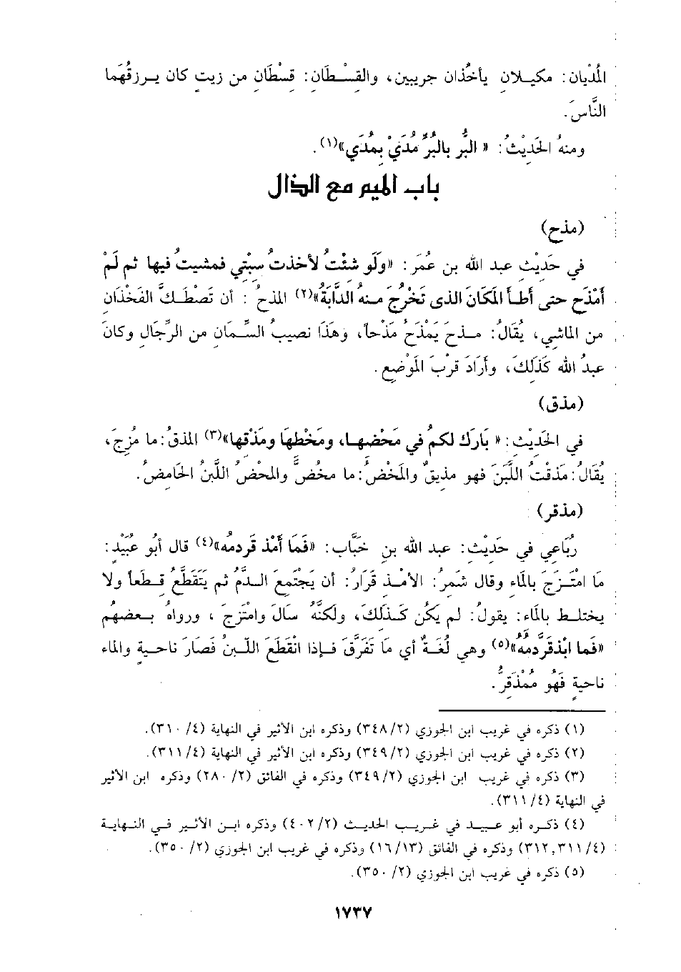 رباعي في حديث: عبد الله بن خباب: (فما أمذ قردمه) قال أبو عبيد: ما امتزج بالماء وقال شمر: الأمذ قرار: أن يجتمع الدم ثم يتقطع قطعا ولا يختلط بالماء: يقول: لم يكن كذلك، ولكنه سال وامتزج، ورواه بعضهم (فما ابذقردمه) وهي لغة أي ما تفرق فإذا انقطع اللبن فصار ناحية والماء ناحية فهو ممذقر.