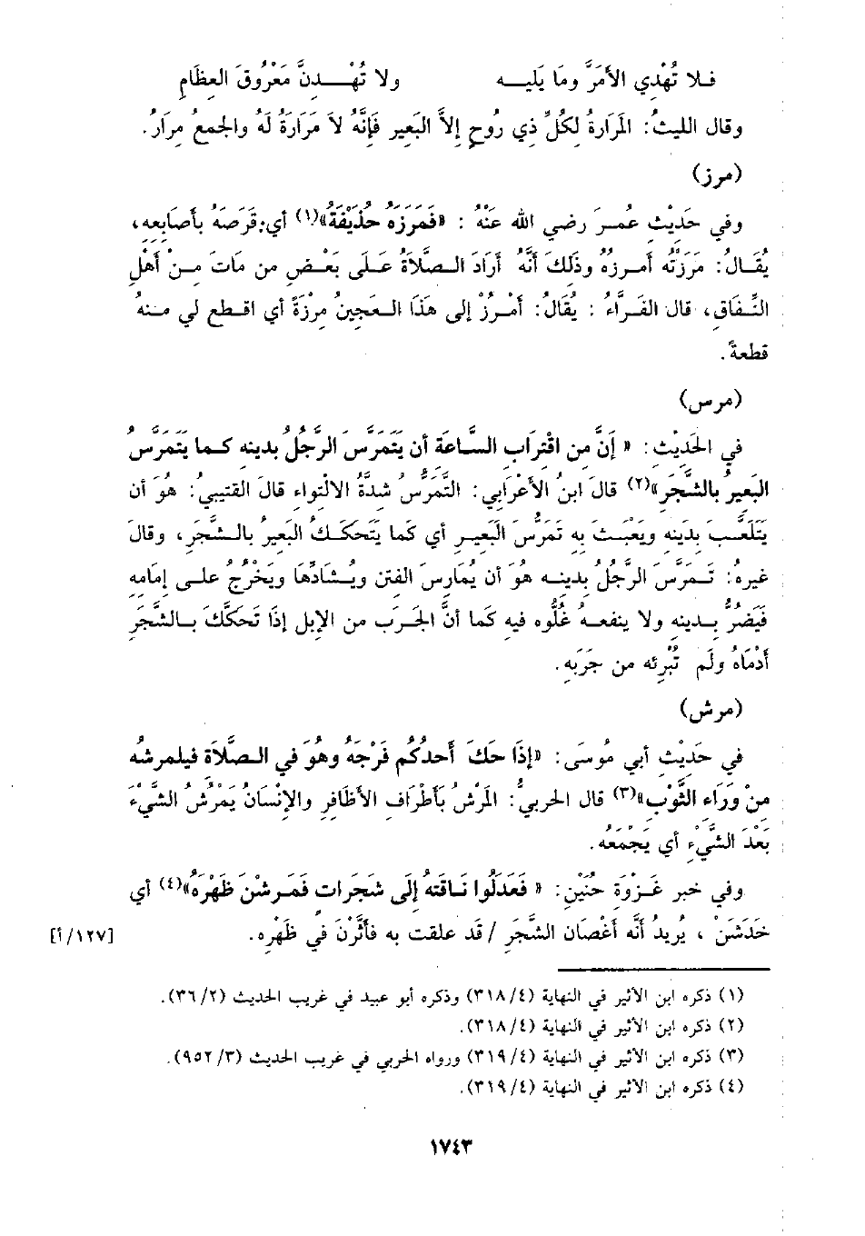 في الحديث: (إن من اقتراب الساعة أن يتمرس الرجل بدينه كما يتمرس البعير بالشجر) قال ابن الأعرابي: التمرس شدة الالتواء قال القتيبي: هو أن يتلعب بدينه ويعبث به تمرس البعير أي كما يتحكك البعير بالشجر، وقال غيره: تمرس الرجل بدينه هو أن يمارس الفتن ويشاهدها ويخرج على إمامه فيضر بدينه ولا ينفعه غلوه فيه كما أن الجرب من الإبل إذا تحكك بالشجر أدماه ولم تبرئه من جربه.