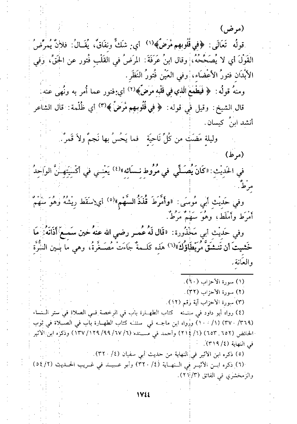 ومنه قوله: {فيطمع الذي في قلبه مرض} أي: فتور عما أمر به ونهى عنه.