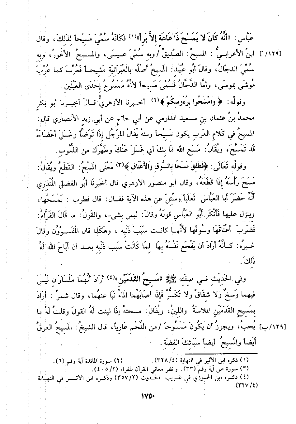 وقوله: {وامسحوا برءوسكم} أخبرنا الأزهري قال أخبرنا أبو بكر محمد بن عثمان بن سعيد الدارمي عن أبي حاتم عن أبي زيد الأنصاري قال: المسيح في كلام العرب يكون مسيحا ومنه يقال للرجل إذا توضأ وغسل أعضاءه قد تمسح، ويقال: مسح الله ما بك أي غسل عنك وطهرك من الذنوب.