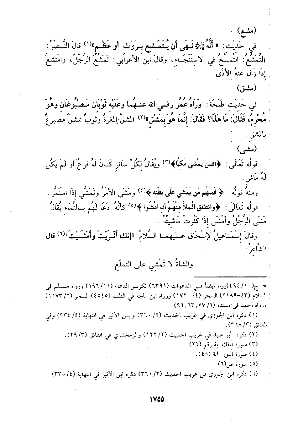 في حديث طلحة: (ورآه عمر رضي الله عنهما وعليه ثوبان مصبوغان وهو محرم، فقال: ما هذا؟ فقال: إنما هو بمشق) المشق: المغرة وثوب ممشق مصبوغ بالمشق.