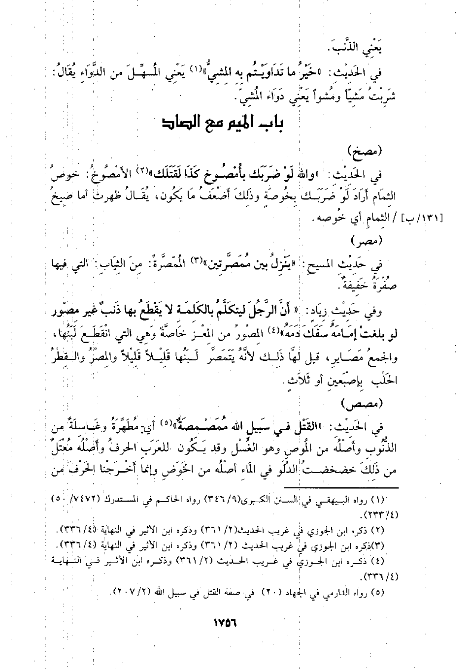 في الحديث: (القتل في سبيل الله ممصمصة) أي: مطهرة وغاسلة من الذنوب وأصله من الموص وهو الغسل وقد يكون للعرب الحرف وأصله معتل من ذلك خضخضت الدلو في الماء أصله من الخوض وإنما أخرجنا الحرف من